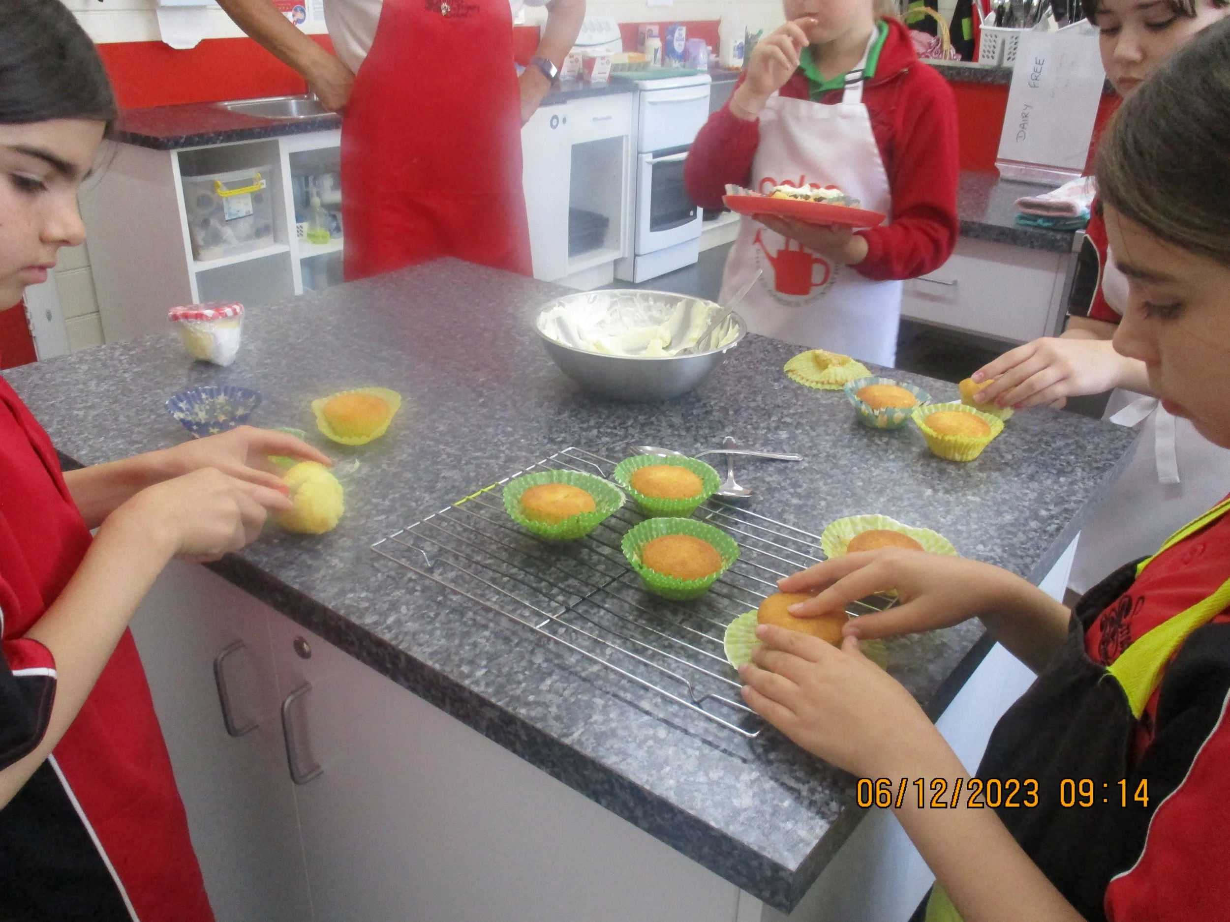 In the kitchen this week junior students made cornflake cookies. They were very good at sharing the mixing while they learnt about creaming butter and sugar. Senior students put their baking skills to work and made Victorian Sponge Cakes. The cream for the sponges was whipped by hand and some students were so good at whipping they inadvertently turned their cream into butter.
