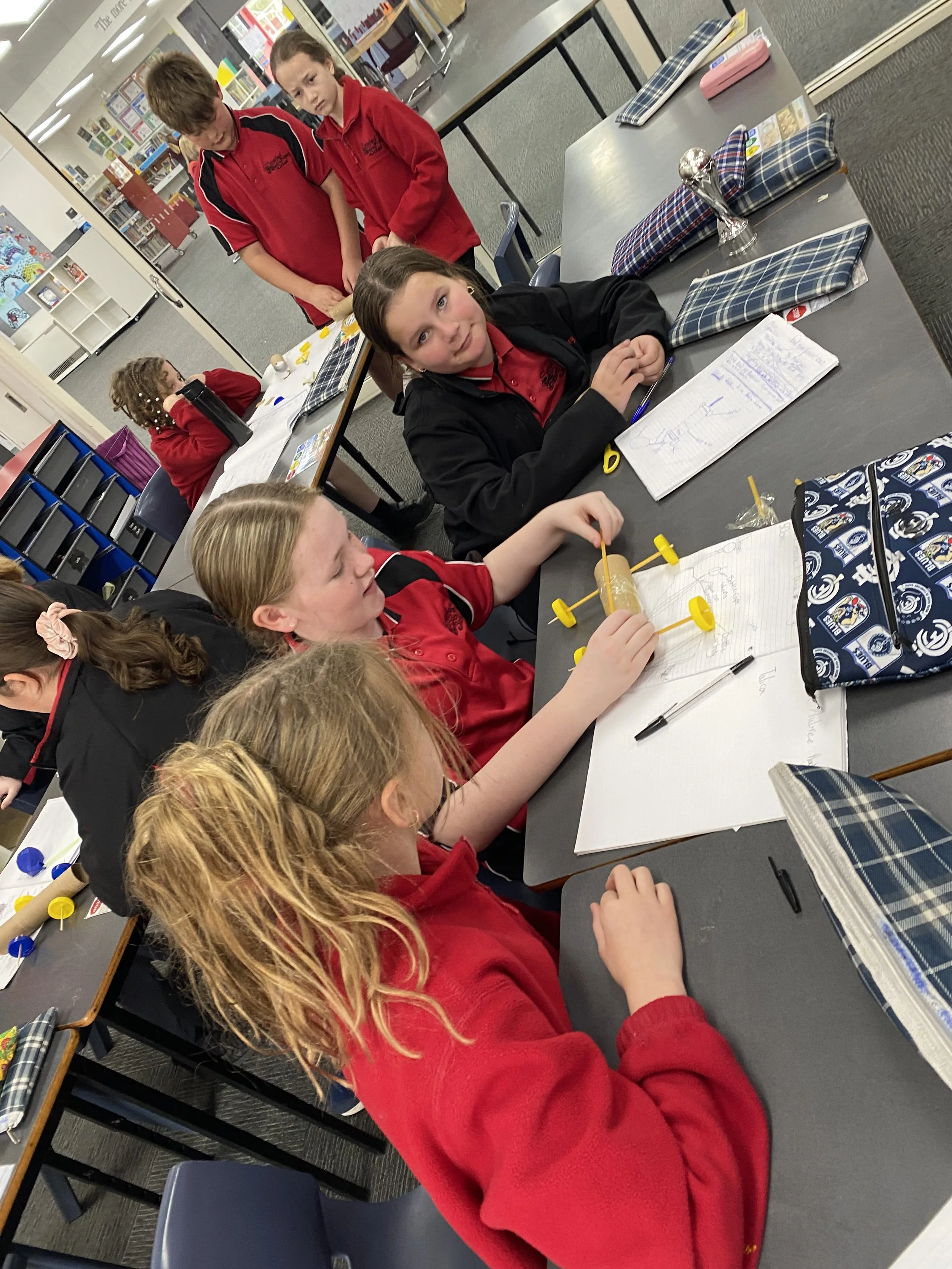Grade 3-4 are learning about potential and kinetic energy. They have designed and built balloon-powered cars and begun testing these. Some worked better than others so students had to determine what changes they need to make to improve the distance their cars can travel.