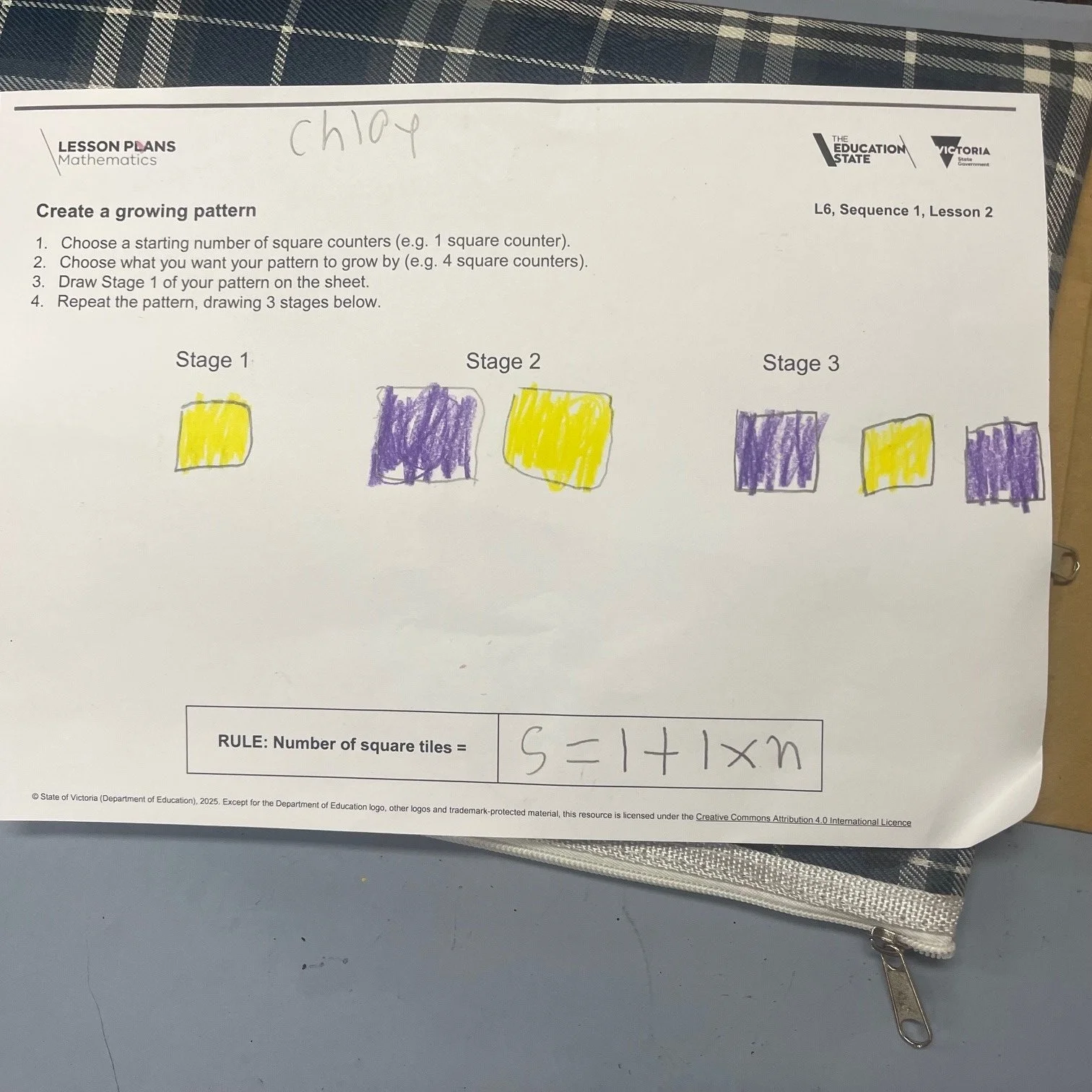 For example, if my pattern starts with 3 squares, and each time after that another two squares are added on, the rule would be: s = 3 + 2n (where s is the number of squares, and n is the stage number).